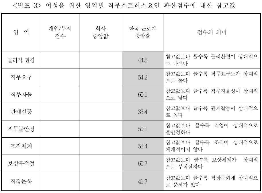직무스트레스요인의 영역별 환산점수는 <별표 2>와 <별표 3>에 참고로 제시된 한국 근로자의 성별 중앙값과 비교하여 상대적인 평가를 내릴 수 있다. 또한 회사에서 집단적으로 측정을 실시하였다면 회사 전체의 측정 중앙값을 산출하여 <별표 2> 또는 <별표 3>의 양식에 기록해 놓고 부서별 평가를 위한 상대적 비교의 참고값으로 사용할 수도 있다.