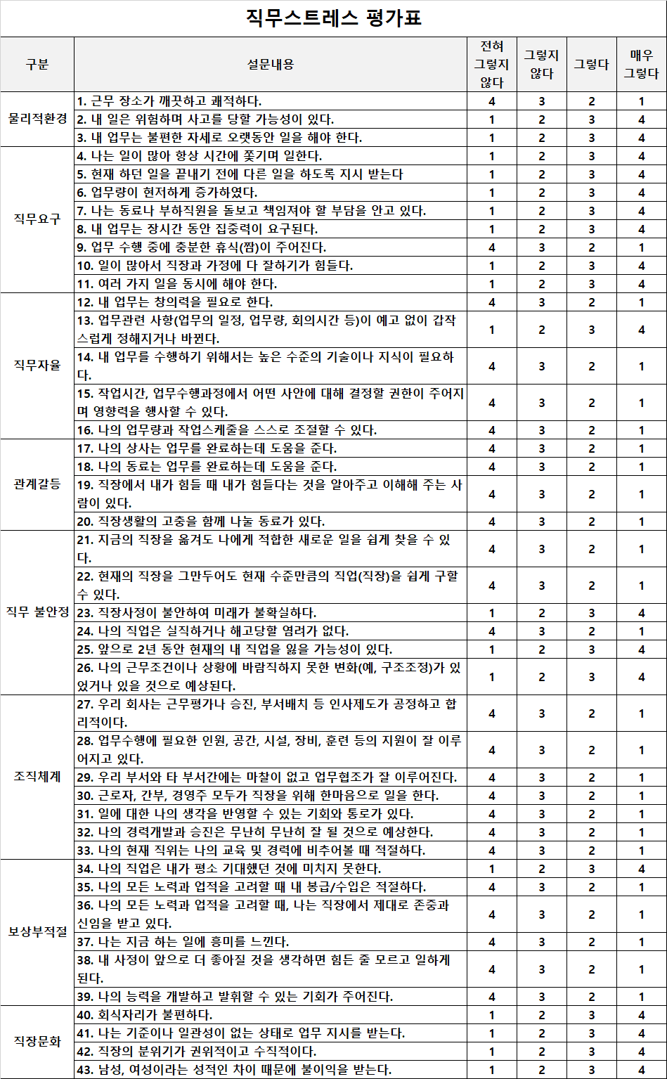 | 관계 갈등 | 회사 내에서의 상사 및 동료 간의 도움 또는 지지 부족 등의 대인관계를 측정하며 동료의 지지, 상사의 지지, 전반적 지지 포함 |