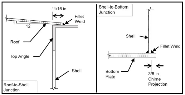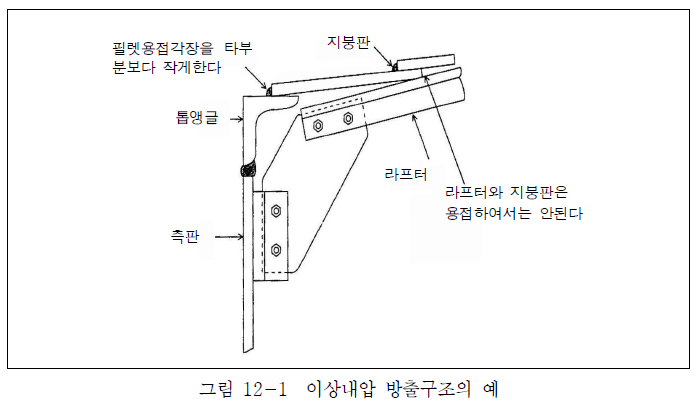 (2) 일반적으로 종설치 원통형탱크에 있어서는 경판(옆판) 윗부분의 톱앵글과 지붕판과의 접합부를 탱크의 다른 접합부보다도 약하게 하는 수가 많다. 이 경우 지붕판과 라프터와는 서로 용접해서는 안 된다(그림 12-1 참고). 또 기타 탱크의