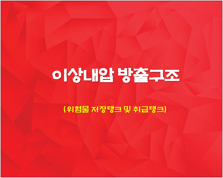 위험물 저장탱크와 취급탱크는 일반적으로 상압탱크와 압력탱크로 설계됩니다. 상압탱크는 Breather Valve, Emergency Hatch, Roof 설계 등의 방법으로 이상내압 방출구조를 갖추게 되며, 압력탱크는 안전밸브(PSV)를 설치하여 이상내압 방출구조로 설계합니다.