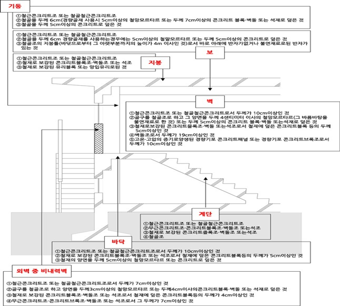 | ※ 건축법 제50조(건축물의 내화구조와 방화벽) 1. 문화 및 집회시설(전시장 및 동·식물원 제외), 종교시설, 장례식장 또는 주점영업의 용도에 쓰이는 건축물로서 관람석 또는 집회실의 바닥면적의 합계가 200㎡(옥외관람석의 경우에는 1천㎡) 이상인 건축물 2. 전시장 및 동· 식물원, 판매시설, 운수시설, 수련시설, 체육관 및 운동장, 위락시설(주점영업의 용도에 쓰이는 것 제외), 창고시설, 위험물저장 및 처리시설, 자동차관련시설, 방송국, 전신전화국 및 촬영소, 화장장 또는 관광휴게시설의 용도에 쓰이는 건축물로서 그 용도에 쓰이는 바닥면적의 합계가 500㎡ 이상인 건축물 3. 공장의 용도에 쓰이는 건축물로서 그 용도에 사용하는 바닥면적의 합계가 2천㎡ 이상인 건축물. 다만, 화재의 위험이 적은 공장으로서 건설교통부령이 정하는 공장은 제외 4. 건축물의 2층이 다중주택·다가구주택, 공동주택, 제1종근린생활시설(의료용에 한함), 의료시설, 아동관련시설, 노인복지시설 및 유스호스텔, 오피스텔 또는 숙박시설의 용도에 쓰이는 건축물로서 그 용도에 쓰이는 바닥면적의 합계가 400㎡ 이상인 건축물 5. 3층 이상의 건축물 및 지하층이 있는 건축물(2층 이하인 건축물의 경우에는 지하층 부분에 한함) 다만, 다중주택·다가구주택을 제외한 단독주택, 동물 및 식물관련시설, 발전시설(발전소의 부속용도로 사용되는 시설을 제외), 교도소 및 감화원 또는 묘지관련시설(화장장 제외)의 용도에 쓰이는 건축물을 제외함 ※ 3, 4, 5항의 경우 지붕틀을 불연재료로 한 지붕틀인 경우 지붕틀을 내화구조로 하지 아니할 수 있음 |