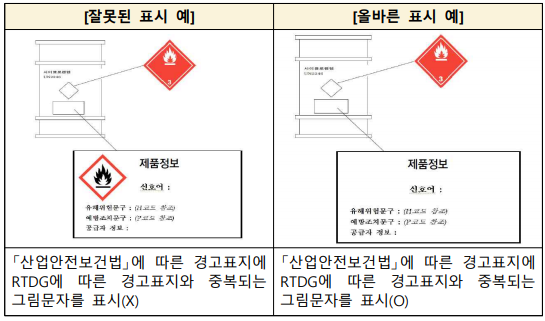 운송에 관한 권고(RTDG)에 따라 경고표지를 작성하여 경고표시를 할수 있고, 이 경우 그림문자는 “RTDG 그림문자”를 사용할 수 있습니다.