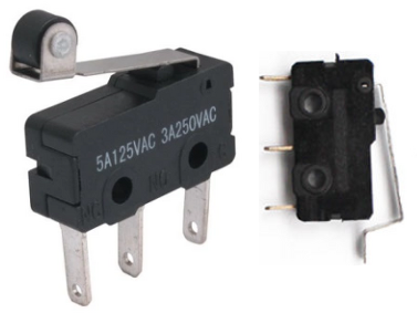 마이크로 스위치 (Micro Switch) 기본 구조는 동일하며 다양한 핀을이 적용하여 사용한다. 마이크로 스위치를 스위치를 눌려야 동작하는 스위치이다. 접점이 3개인 이유는 하나는 공통으로 사용하고 나머지 두 개의 접점을 N.C 와 N.O로 사용한다. |