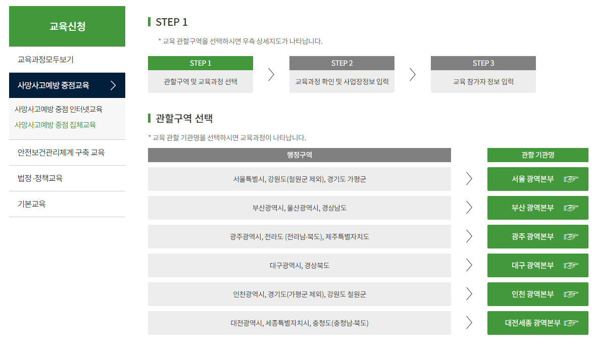 ①교육신청[사망사고예방 중점교육]→ ②지역선택→ ③과정선택(신청자 및 사업장 정보입력)