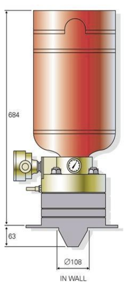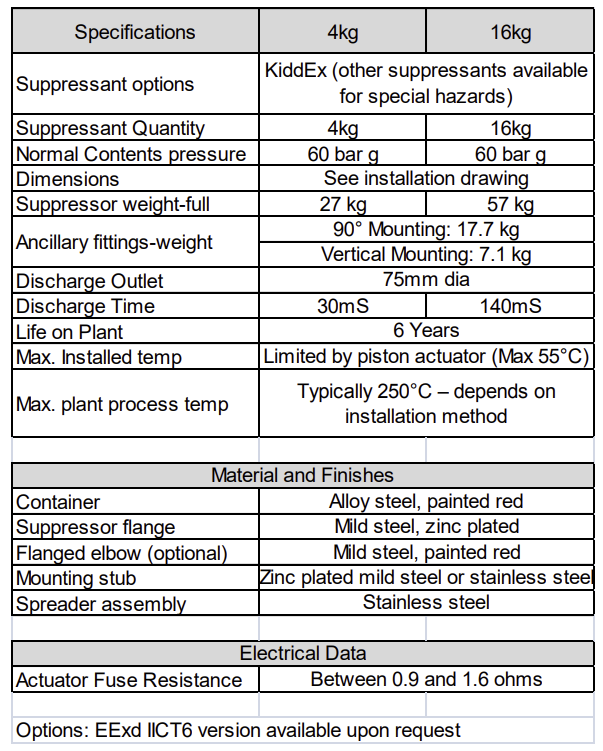 3kg, 4kg 또는 16kg의 분말 억제제를 채우고 건조 질소로 60bar(880psi)로 가압한 원통형 합금강 용기. 플랜지 내부에는 래치로 닫힌 상태로 유지되는 빔으로 지지되는 힌지 플랩이 있습니다. 2개의 피스톤 비폭발 각도기 작동 액추에이터가 개방을 시작하는 데 사용됩니다. 액추에이터가 연결된 제어 장치의 전기 임펄스를 통해 활성화되면 피스톤이 래치를 움직여 플랩을 열 수 있습니다. 그런 다음 질소는 스프레더 어셈블리를 통해 보호된 볼륨으로 억제제를 빠른 속도로 배출합니다.