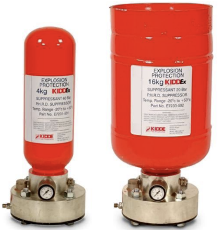 이러한 억제기는 가스, 솔벤트 증기 및 가연성 분진 의 폭발 억제에 사용됩니다