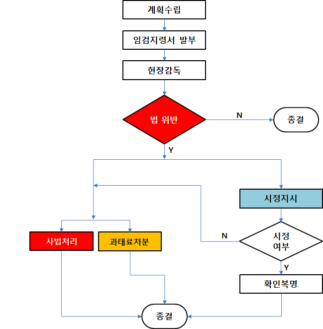 | 사법처리 | 벌칙대상 산업안전보건법 위반사항 발견 시 사업장관계자 조사 → 입건 (범죄인지) 피의자신문 → 사건송치(검찰) 사업주는 관계자 조사 시 개선된 증빙자료 또는 이의제기 내용을 진술할 수 있으며, 별도 의견서를 제출할 수도 있습니다. |