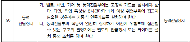 모터 구동부의 안전덮개와 경보예고장치입니다. 아래 안전기준과 같이 동력전달부는 고정식가드를 설치해야 하니 자율안전확인신고를 계획하신다면 반드시 설치해두시기 바랍니다. 경고예보장치는 작업자에게 시각적, 청각적 경보를 주는 장치로 기계의 불시기동에 대해 대비할 수 있도록 해주는 방호장치입니다.