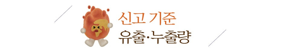* 화학물질(사고대비 물질 제외)의 유출, 누출량이 1Kg 또는 1L미만(실험실의 경우100g 또는 mL)이고, 인명피해, 환경피해가 없이 방재조치 완료된 경우에는 관계 행정기관에 신고하지 않을 수 있음.