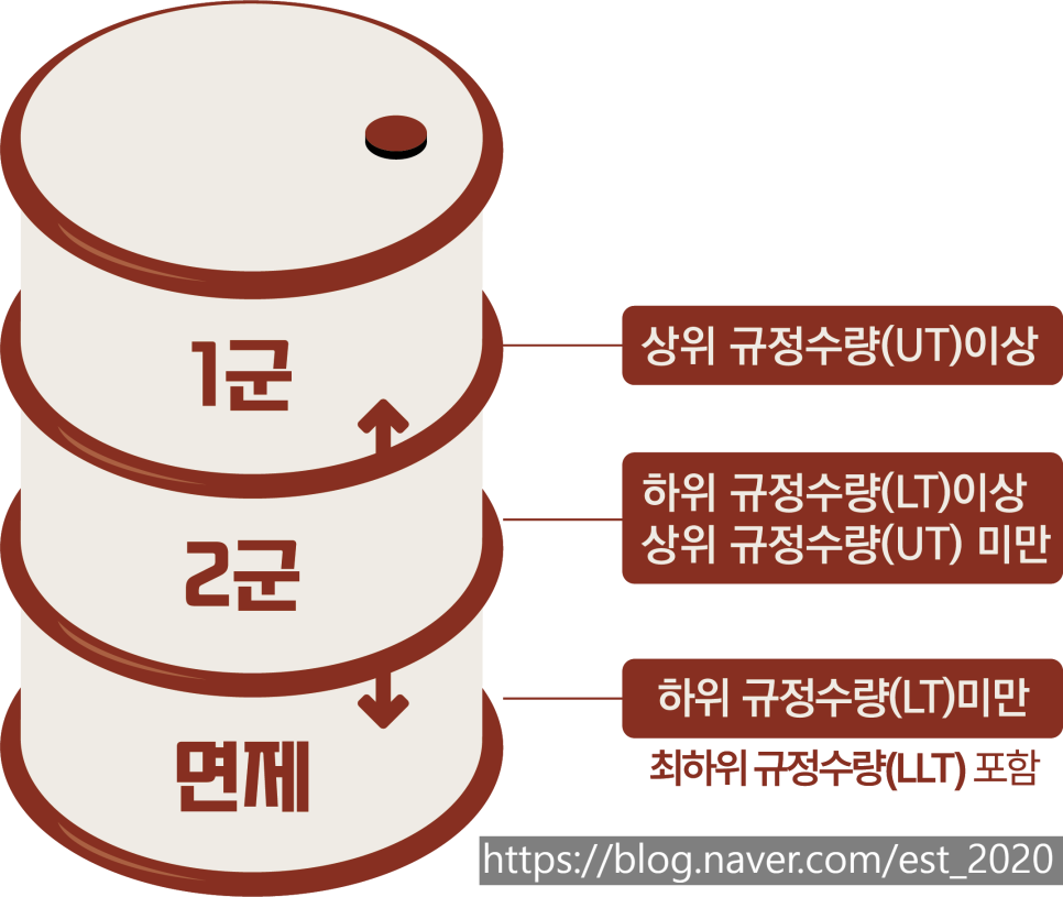 | 2군 | 화학물질안전원 고시 [유해화학물질의 규정수량에 관한 규정]에 따른 규정수량 산정시 상위 규정수량(UT) 미만 하위 규정수량(LT) 이상 취급 사업장 | |