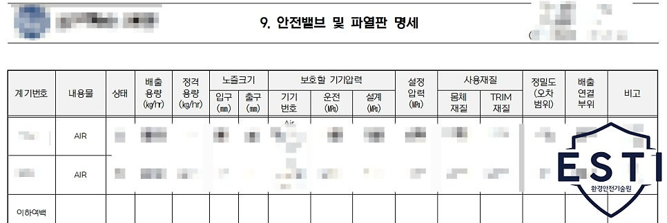 해당 사업장에서 공기압축기 등의 사용으로 안전밸브 및 파열판 명세에 대한 내용이 작성되어야 했어요.