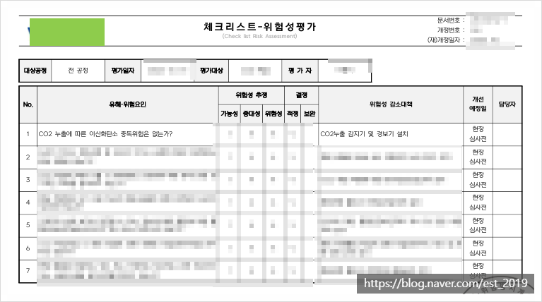 사업장에서 실시하는 공정별 위험성평가와 더불어 체크리스트 기법을 활용한 기계별 위험성평가서를 제출합니다. 위험성평가는 사업장에서 파악한 유해위험요인에 대한 실질적 개선대책에 대한 행위로 유해위험방지계획서 제도를 이행하며 꼼꼼히 서류화합니다. 이때 아래 주의사항 참고하시기 바랍니다.