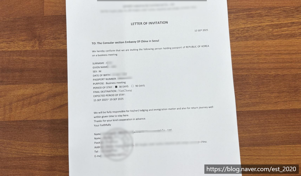 아래와 같이 출장 초청장을 보내주신다면