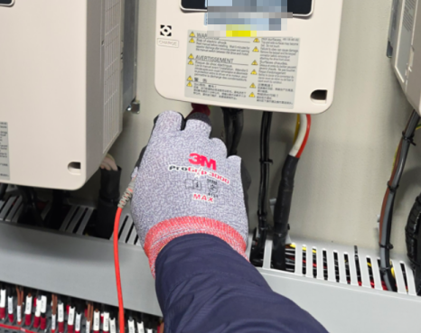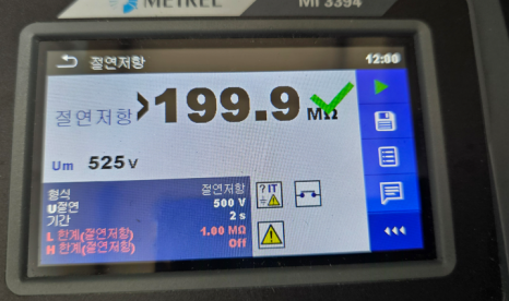 ⇒ 접지연속성시험과 필수적으로 요구되는 절연저항 시험입니다. 절연이 불량하면 전류가 외함이나 구조물에 흐를 수 있어 작업자가 감전될 위험이 있고 전기적 간섭이나 누전으로 인해 센터, 모터 등의 오작동이 발생할 수 있습니다. 이를 방지하기 위해 반드시 절연상태를 확인해야 하며 해당 시험 마찬가지로 전문 시험원이 실시해 이상없음을 확인할 수 있었습니다.