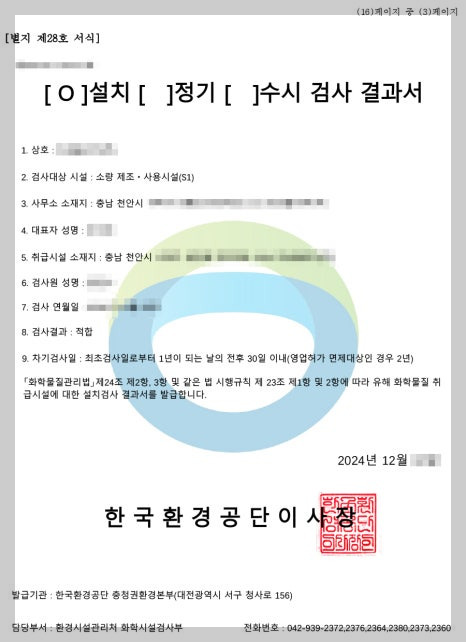 - 유해화학물질 취급시설 검사결과신고서 및 적합판정을 받은 설치검사결과서 사본 각 1부