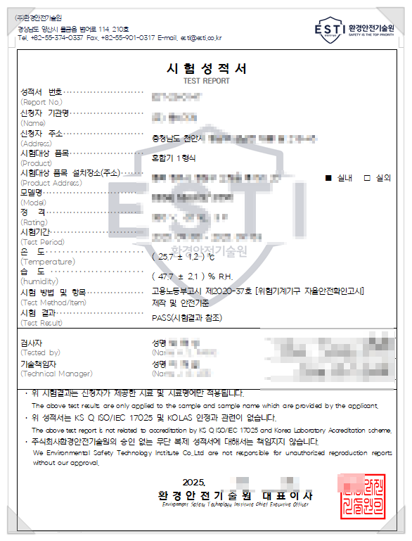 ▶ 전기적 안전성을 확보하기 위한 전기안전시험으로, 산업용 혼합기는 접지연속성시험과 절연저항 시험에 대한 성적서를 제출해야 합니다.접지연속성시으로 확인할 수 있는건 보호접지 회로의 연결 상태, 전기안전 기준 충족 여부 등이 있으며 해당 혼합기는 측정값이 적합함을 확인하며 성적서에 반영할 수 있었습니다.