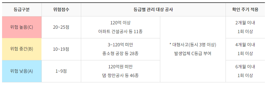 최근 10년 기준으로 사망재해 발생 수준을 수치화하여 유해․위험방지계획서 대상현장별로 위험등급을 지정(A~C등급)하고, 고위험 현장은 계획서 확인주기를 단축하는 등 차등 관리