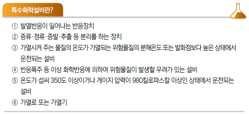 2) 화학설비 :「산업안전보건기준에 관한 규칙[별표9]」기준량 이상을 취급하는 특수화학설비를 설치·이전·변경하는 경우